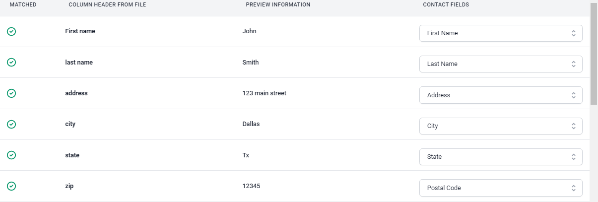 Once you upload your list, the next step will to make sure the column headers from the CSV file andthe contact fields match up. If they don't, you will want to add those missing custom fields