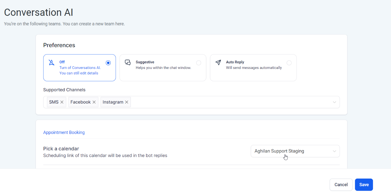 The "Supported Channels" section allows you to select the platforms where Conversation AI will be active. The following channels are currently supported: