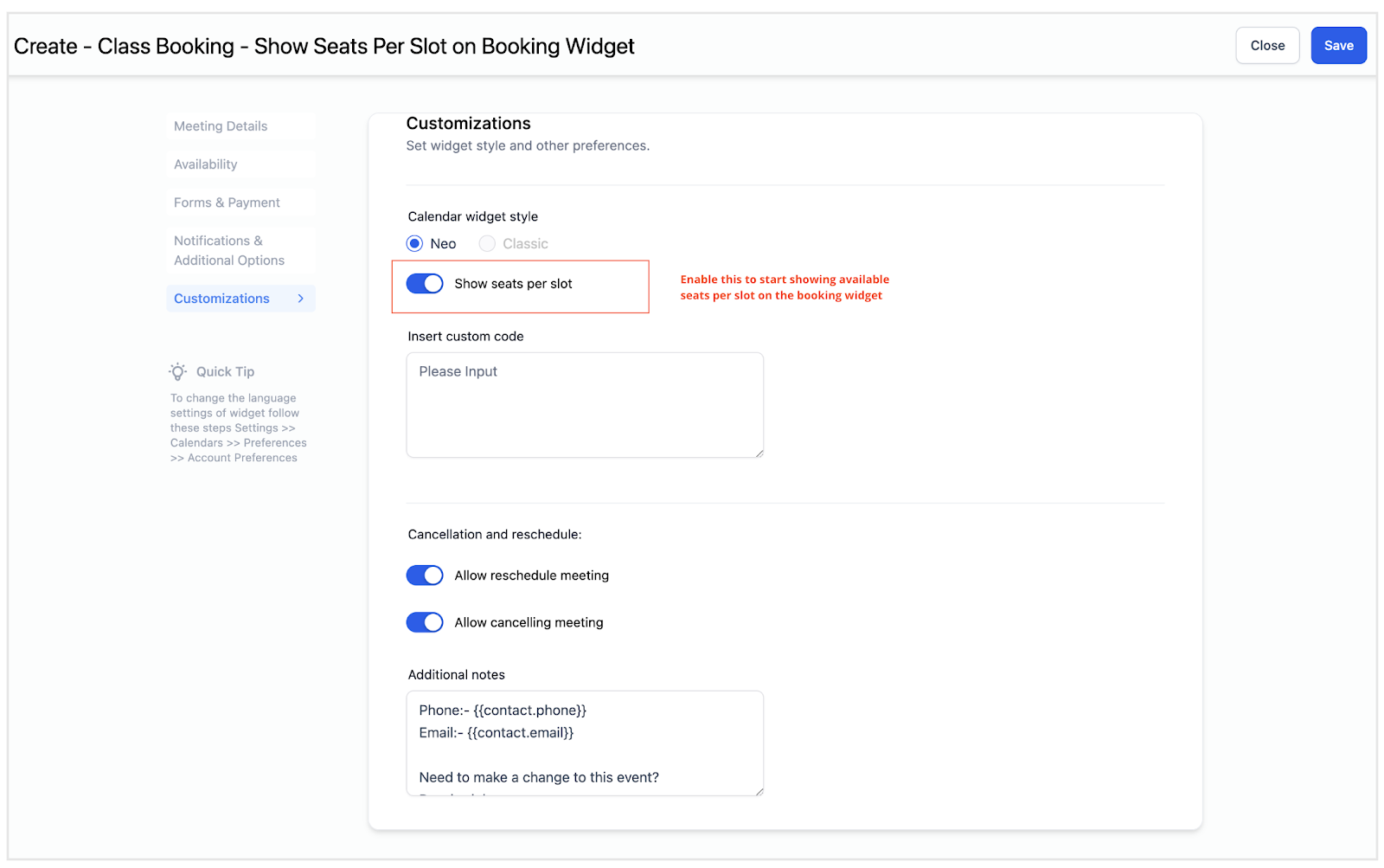 Answer: To enable this feature, click on "Edit" in the calendar's advanced settings, navigate to "Customisations," find "Calendar widget style," and toggle on the "Show seats per slot" option. Don't forget to save your settings.