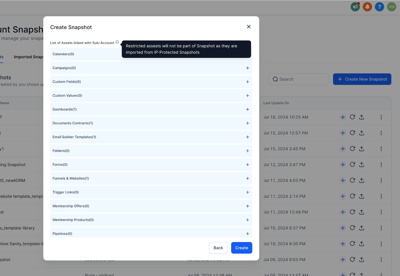 Restricted Assets: It also highlights any assets that are IP protected within the sub-account and will not be included in the snapshot.