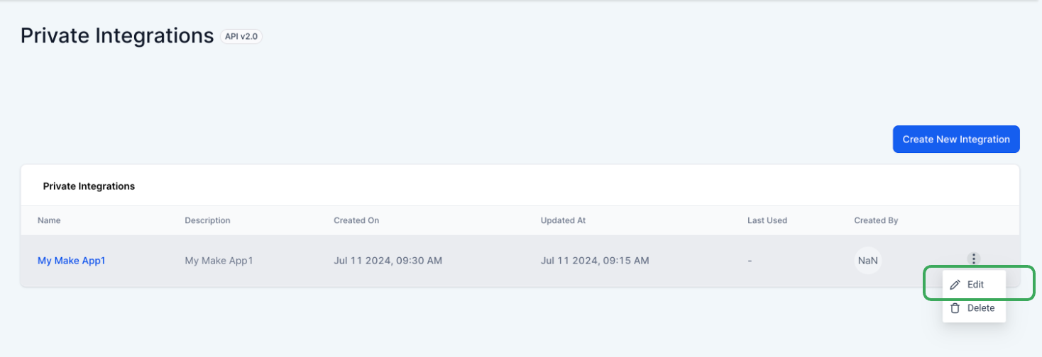 Step 1: Navigate to Private Integrations under settings, and select "Edit" from the three-dot menu.