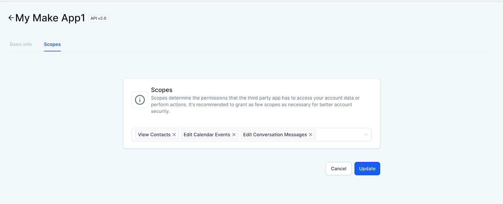 Step 3: If required, update the scopes/permissions that you want the private integration to have access to on your account. Ensure that you are selecting only the required scopes for better data security. Click on "Update" to save the updates made.