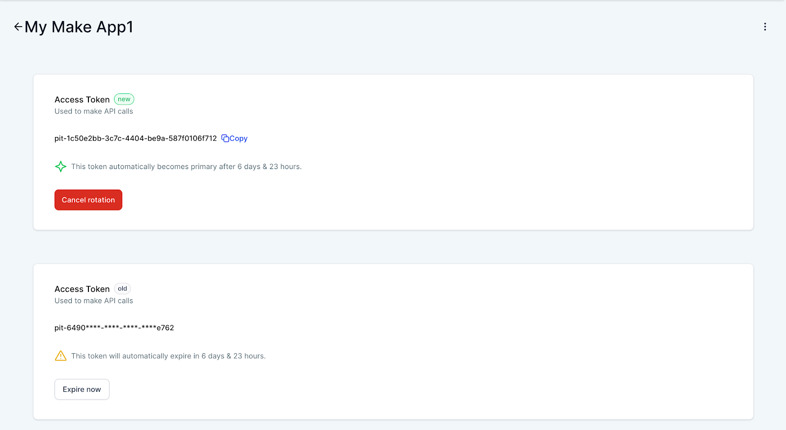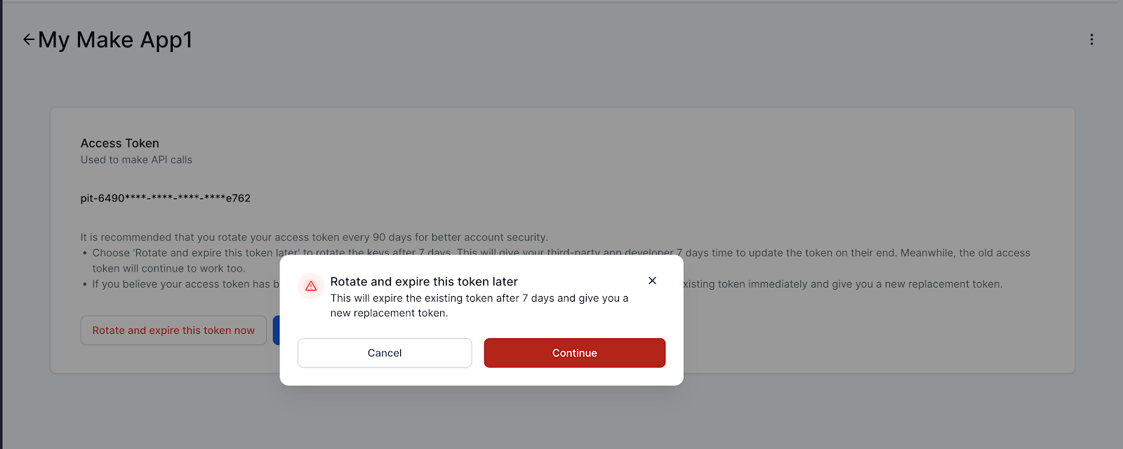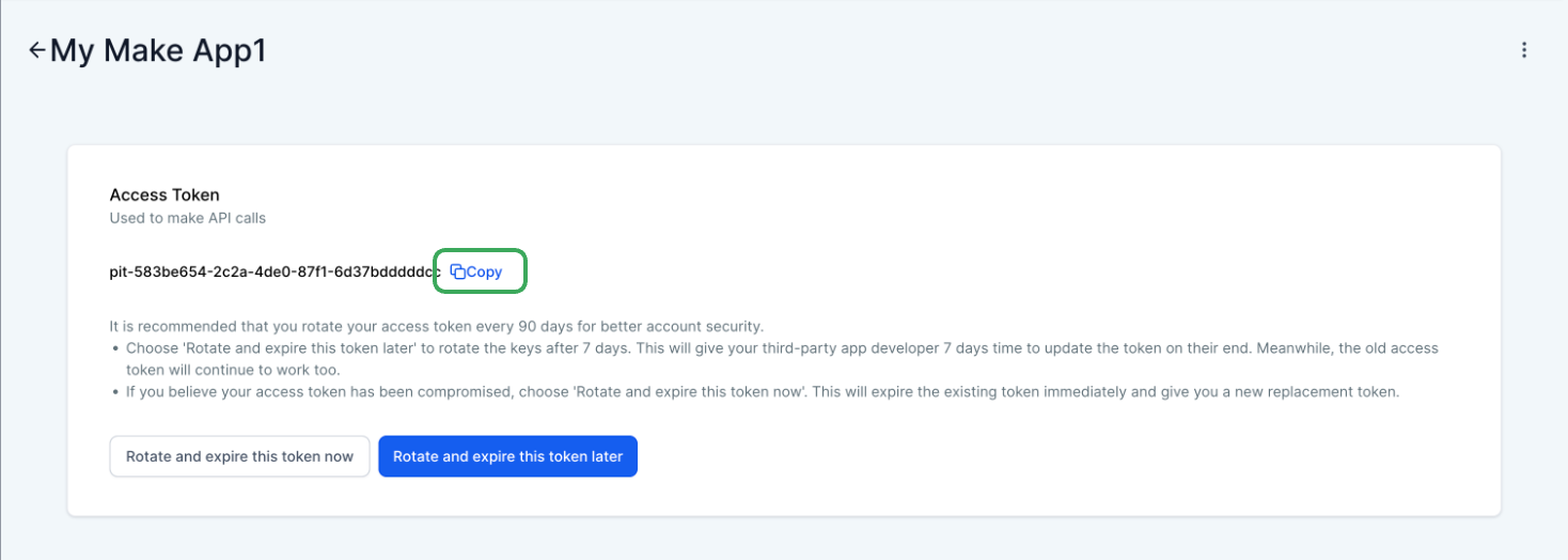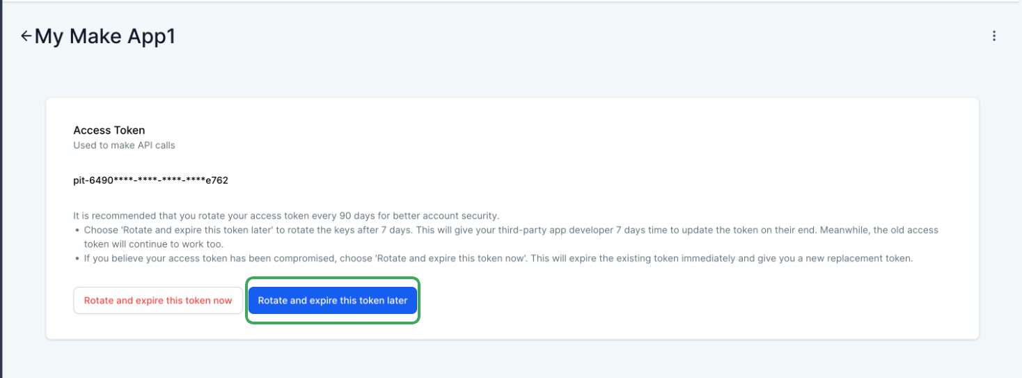 Step 4: Copy the new token and update it on your third-party app. You will have a 7 day window where both the old and the new tokens will continue to work. After 7 days, the old token will expire. In this 7 day window, you will have the option to: