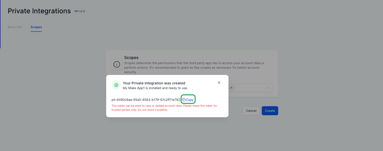 Note: Updating the Private Integration details does not generate a new token. The existing token will continue to work.