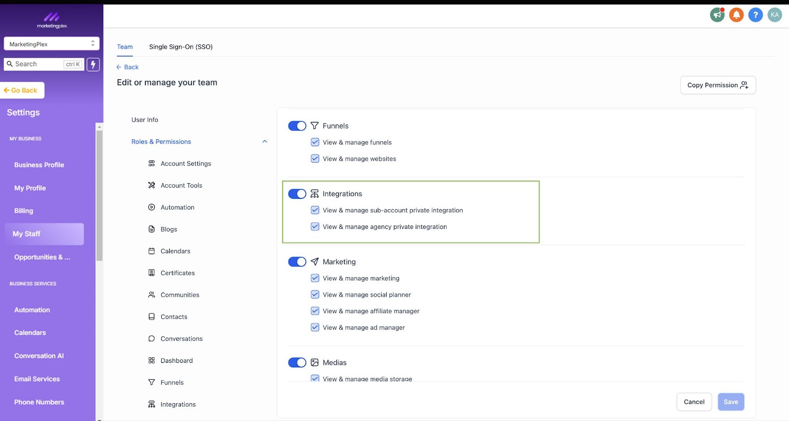 However, you can restrict this permission at a user level. To do this, Navigate to Settings > My Staff > Edit the specific agency admin > Roles & Permissions, and enable/disable Private Integrations for the agency admin.