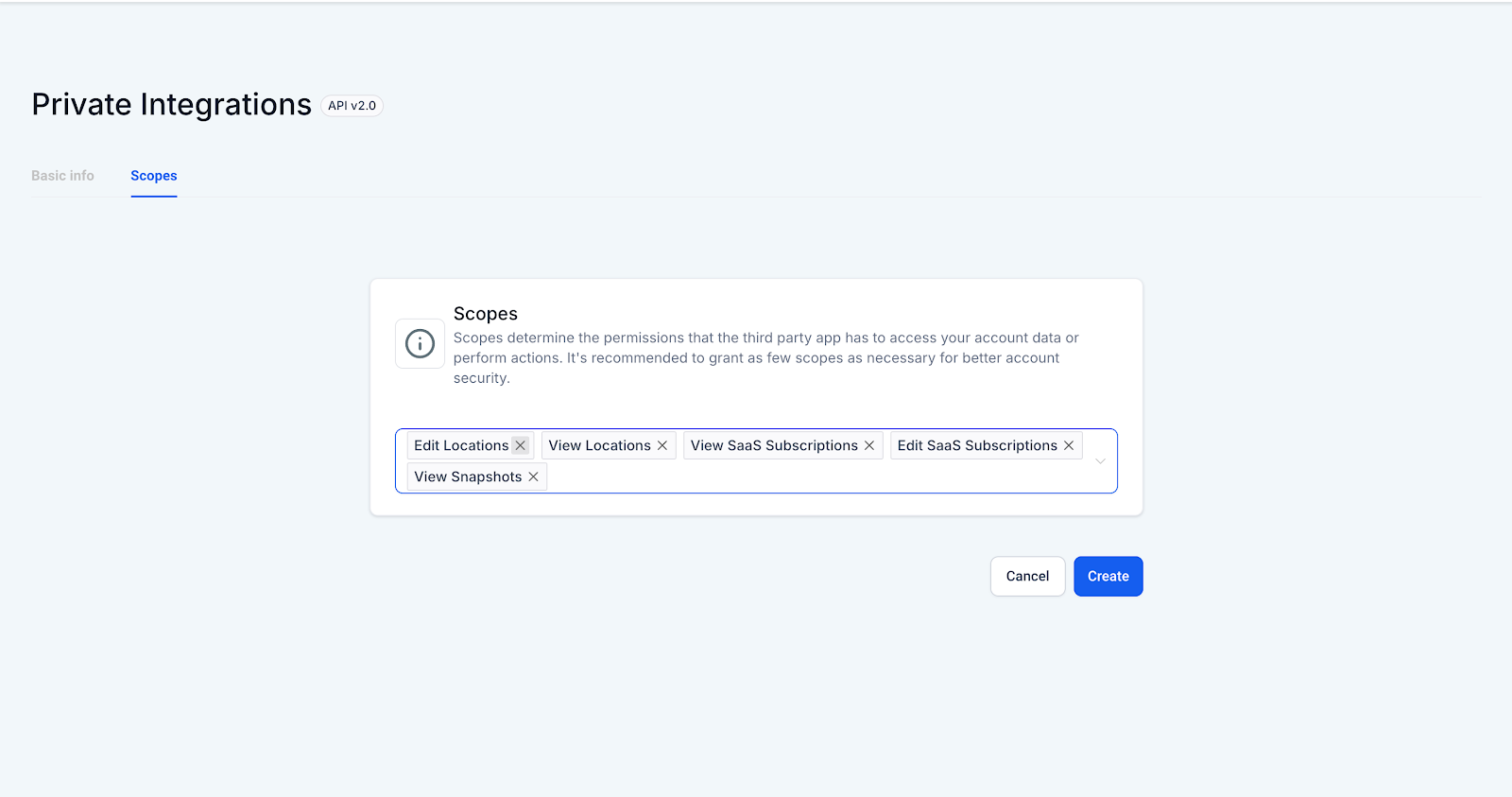 Step 3: Select the scopes/permissions that you want the private integration to have access to on your agency account. Ensure that you are selecting only the required scopes for better data security.