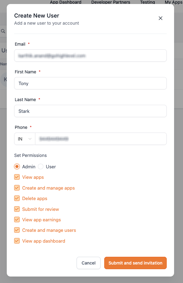 Enter the new user's details including their email and assign a role (Admin or User).