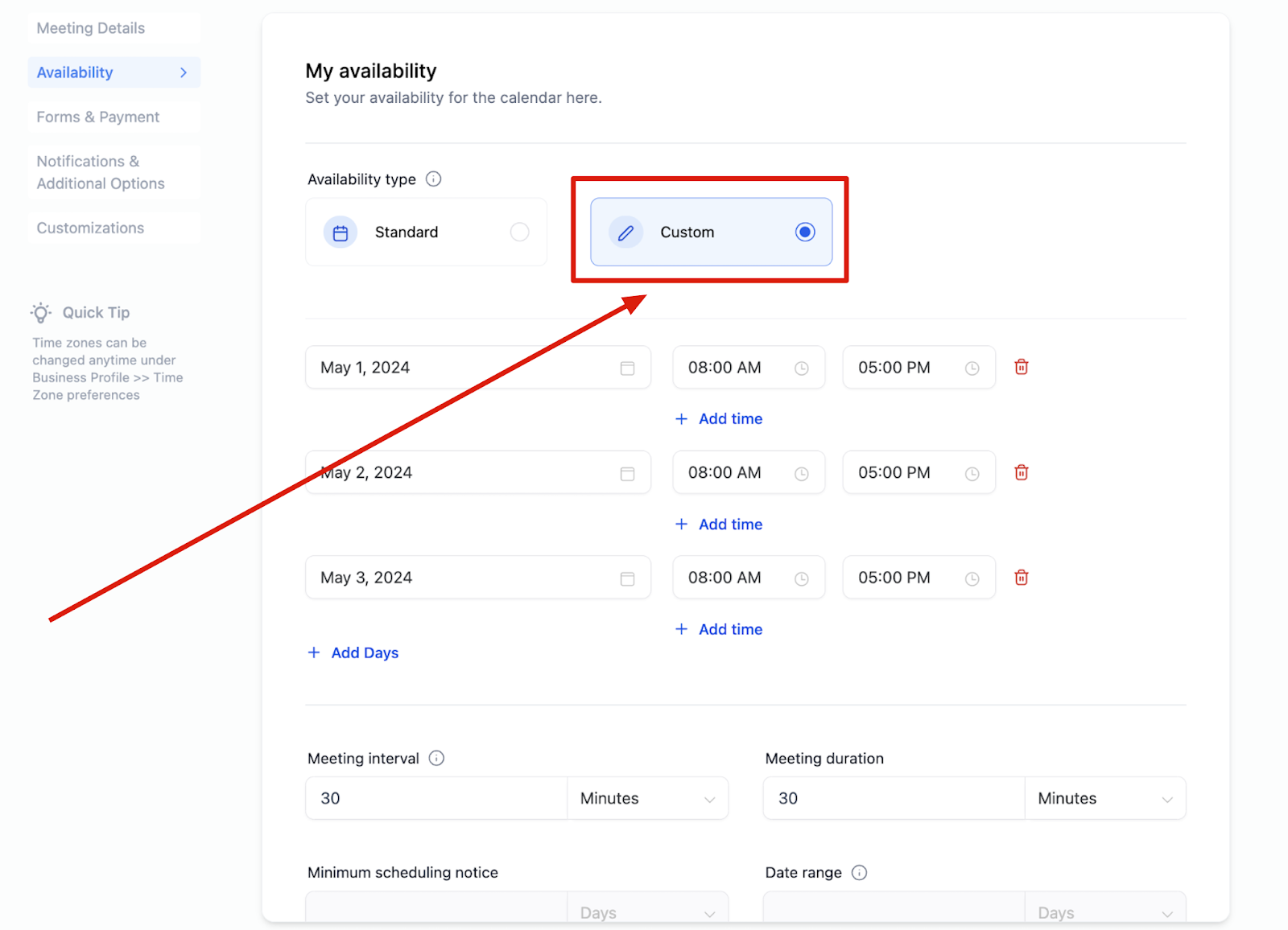 Previously, we had two distinct availability configurations: Standard Availability and Custom Availability. With recent updates, these have evolved into Weekly Working Hours and Date-Specific Hours - two types of availability settings to cater to your diverse needs.