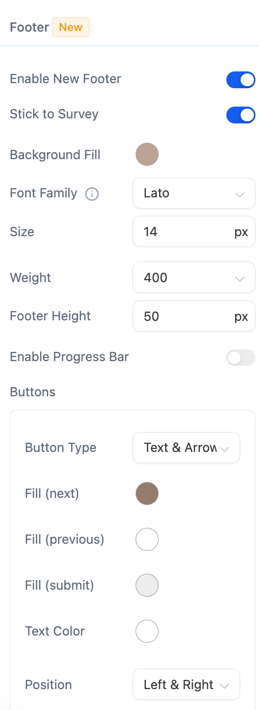 You can now tailor your survey footer by customizing themes, background, font, height, progress bar, button color, and position, allowing it to align seamlessly with your brand identity. Choose from various themes, including progress bars, and enjoy real-time previews for instant feedback. The footer can also stick to each slide, ensuring a smooth user experience. New surveys will have these customization options enabled by default, while existing surveys can be upgraded to benefit from the enhanced footer features.
