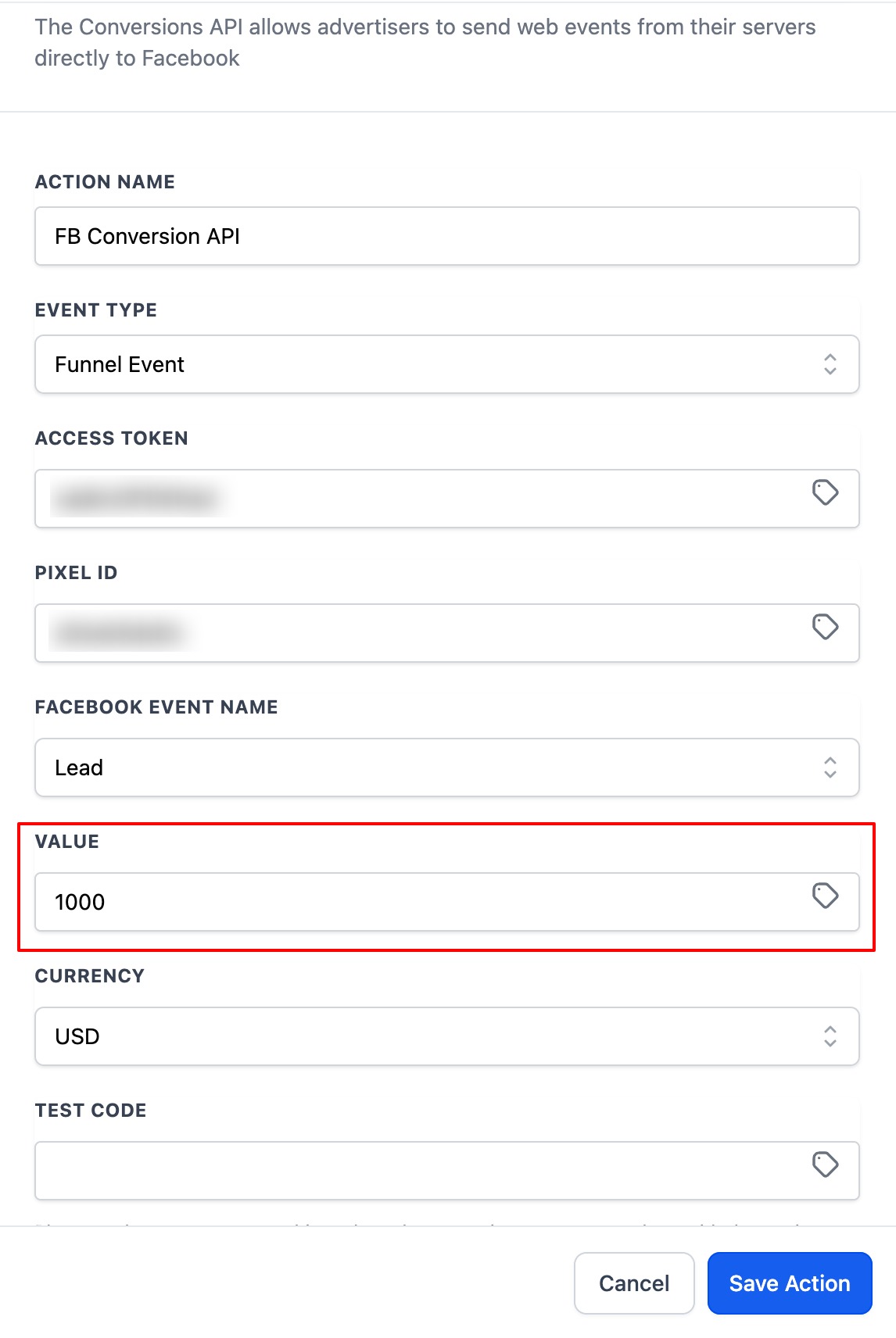 Paste the Access Token and Pixel ID in the Facebook Conversion API Action's respective fields.