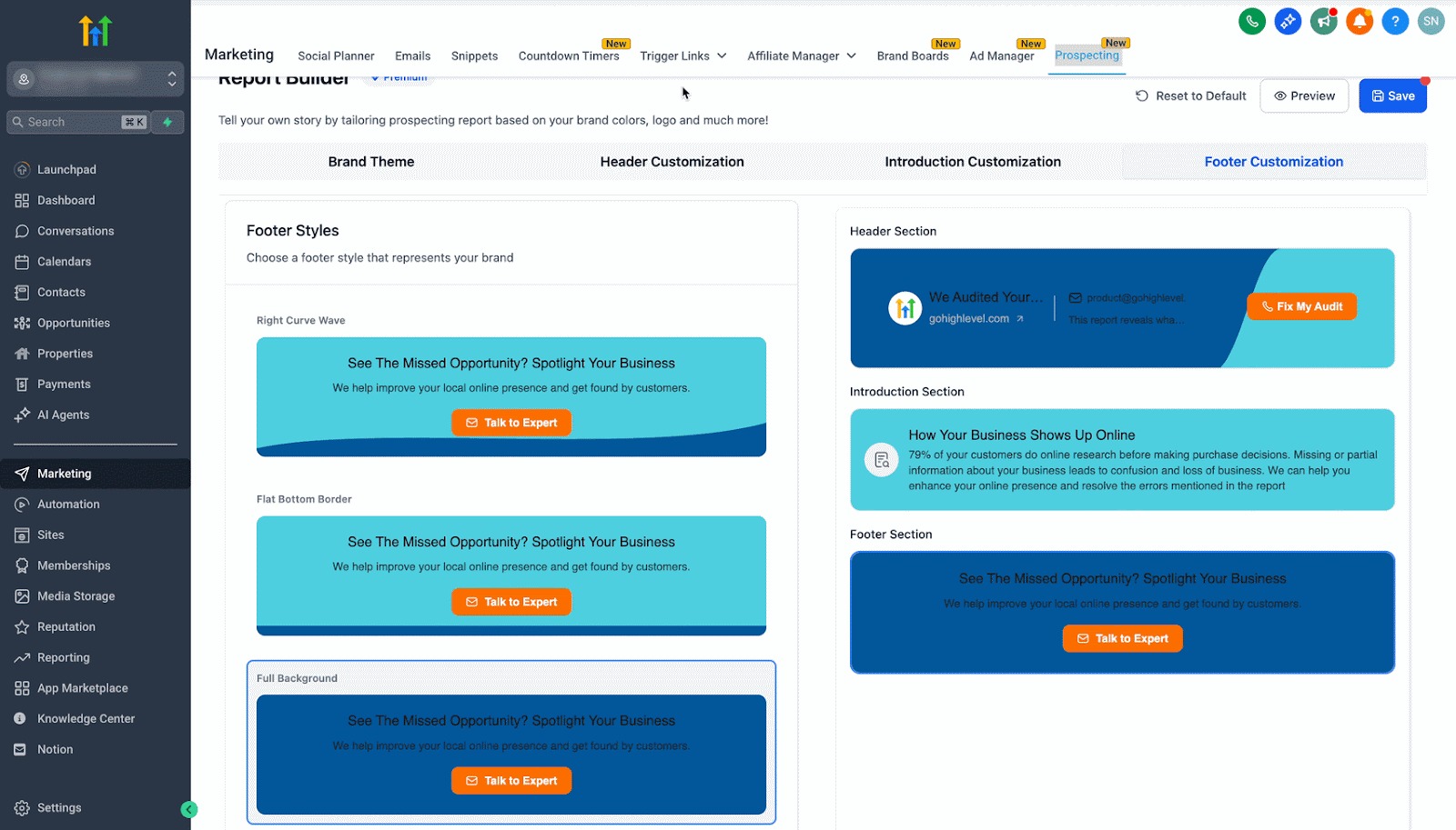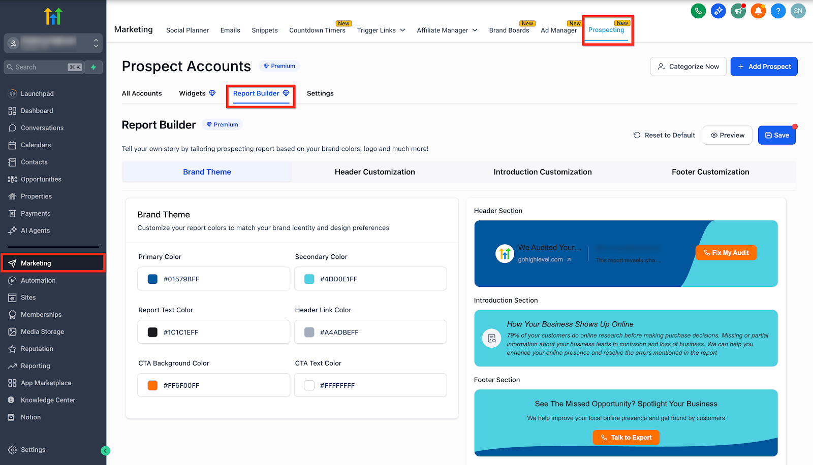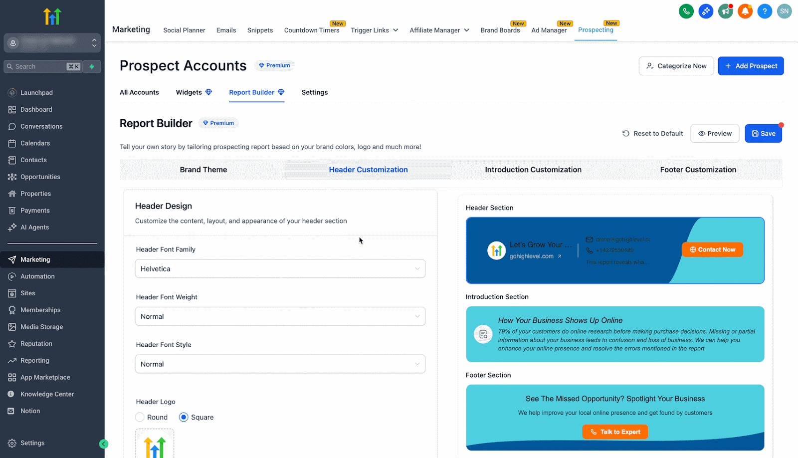 This premium feature is designed to give users full control over the appearance and content of their prospect reports. It enables agencies and locations to customize their report’s brand theme, header, introduction message, and footer sections, ensuring that every report reflects a distinct, professional identity. With an easy-to-use interface and live preview capabilities, you can build and refine reports that not only look great but also drive engagement.