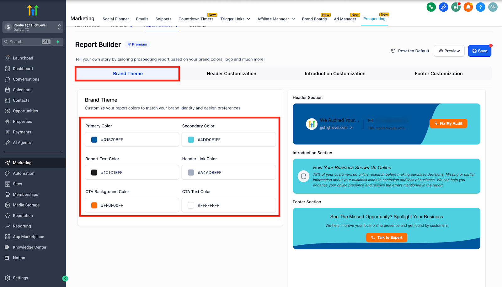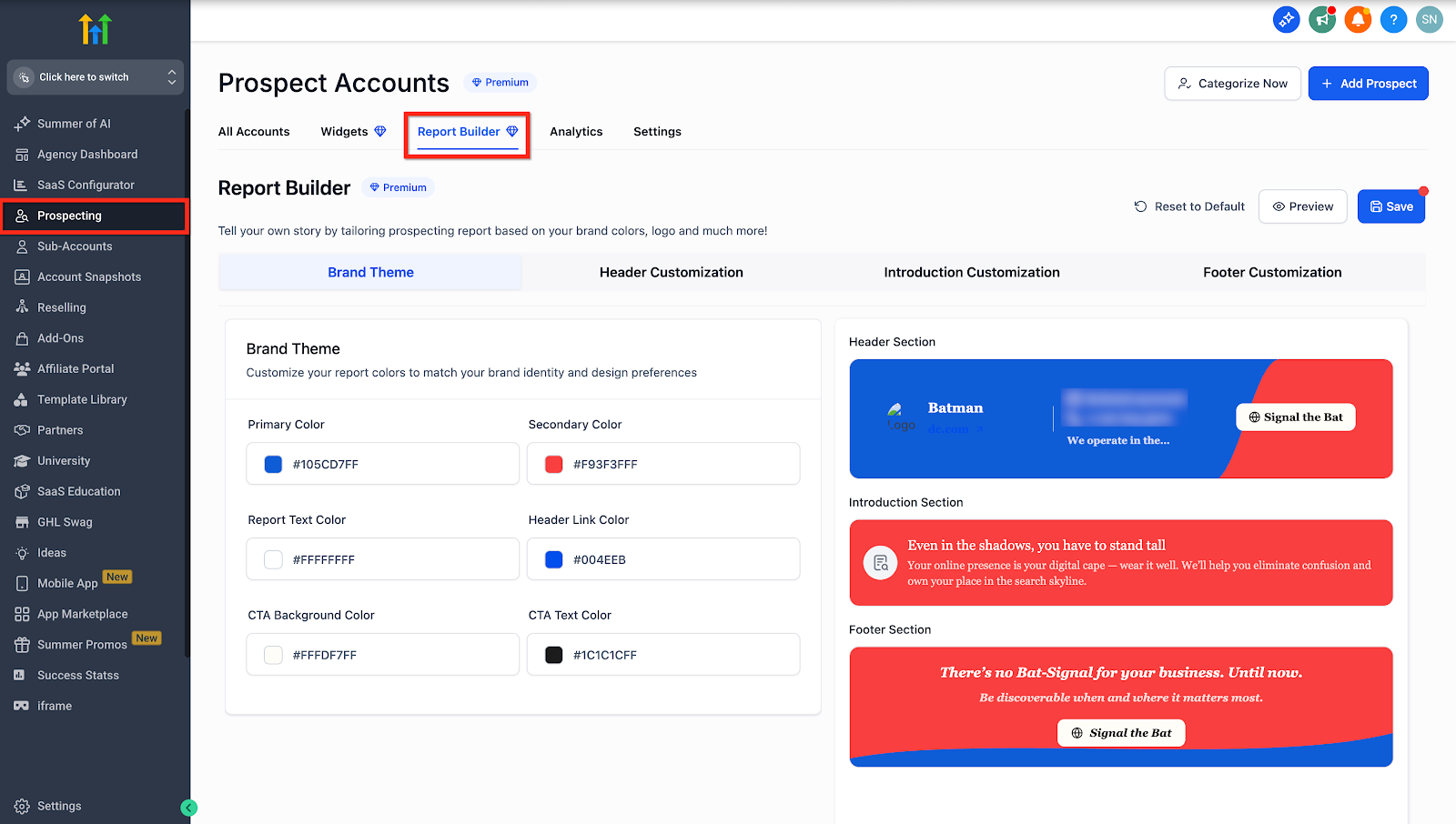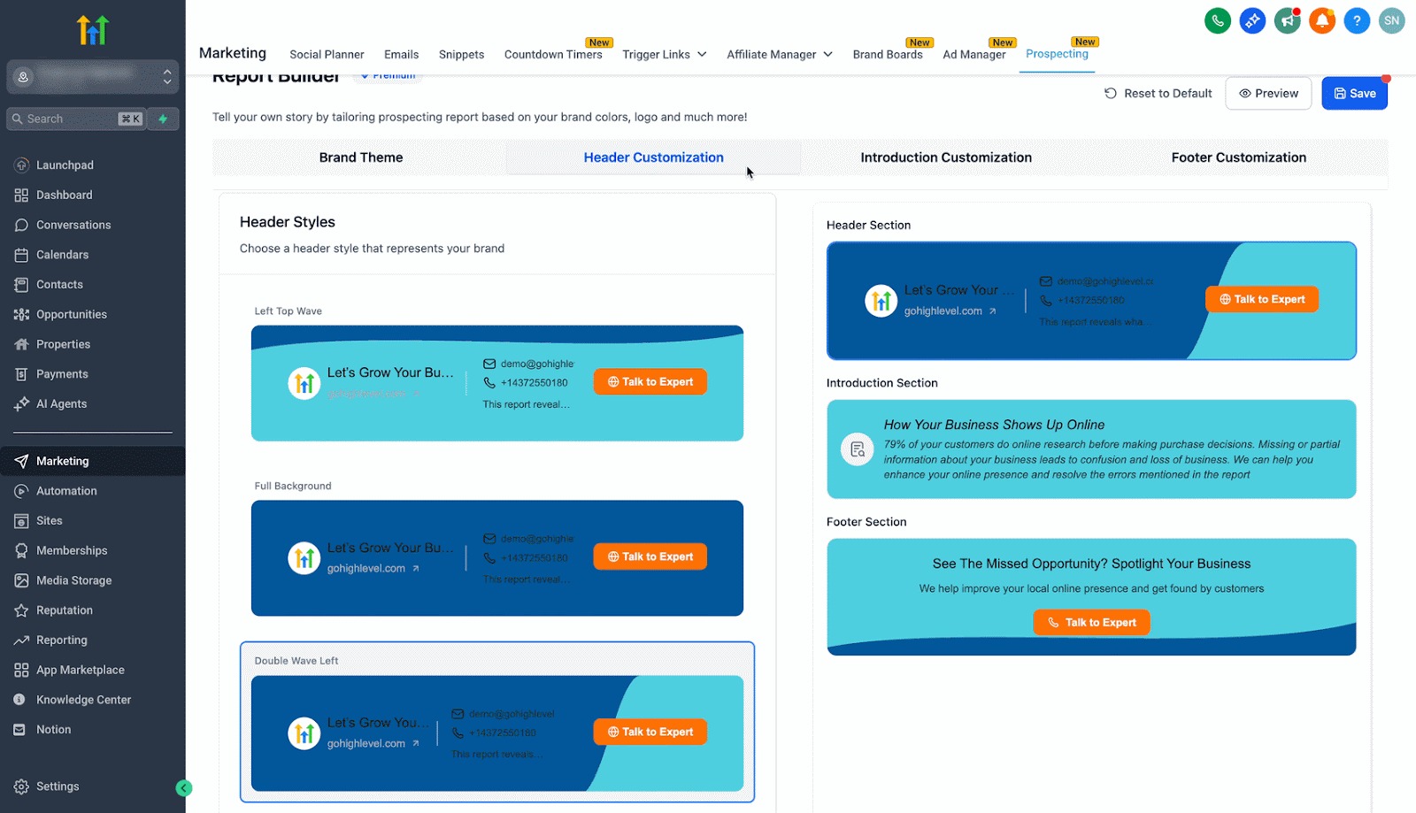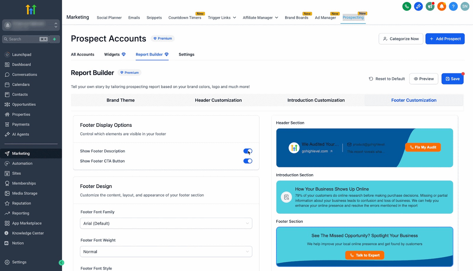 This premium feature is designed to give users full control over the appearance and content of their prospect reports. It enables agencies and locations to customize their report’s brand theme, header, introduction message, and footer sections, ensuring that every report reflects a distinct, professional identity. With an easy-to-use interface and live preview capabilities, you can build and refine reports that not only look great but also drive engagement.
