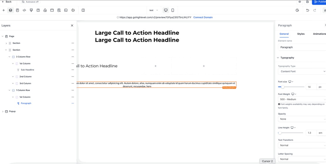 Nested Layouts are easy to implement using the Funnel or Website Builder’s drag-and-drop interface. Here’s how to get started: