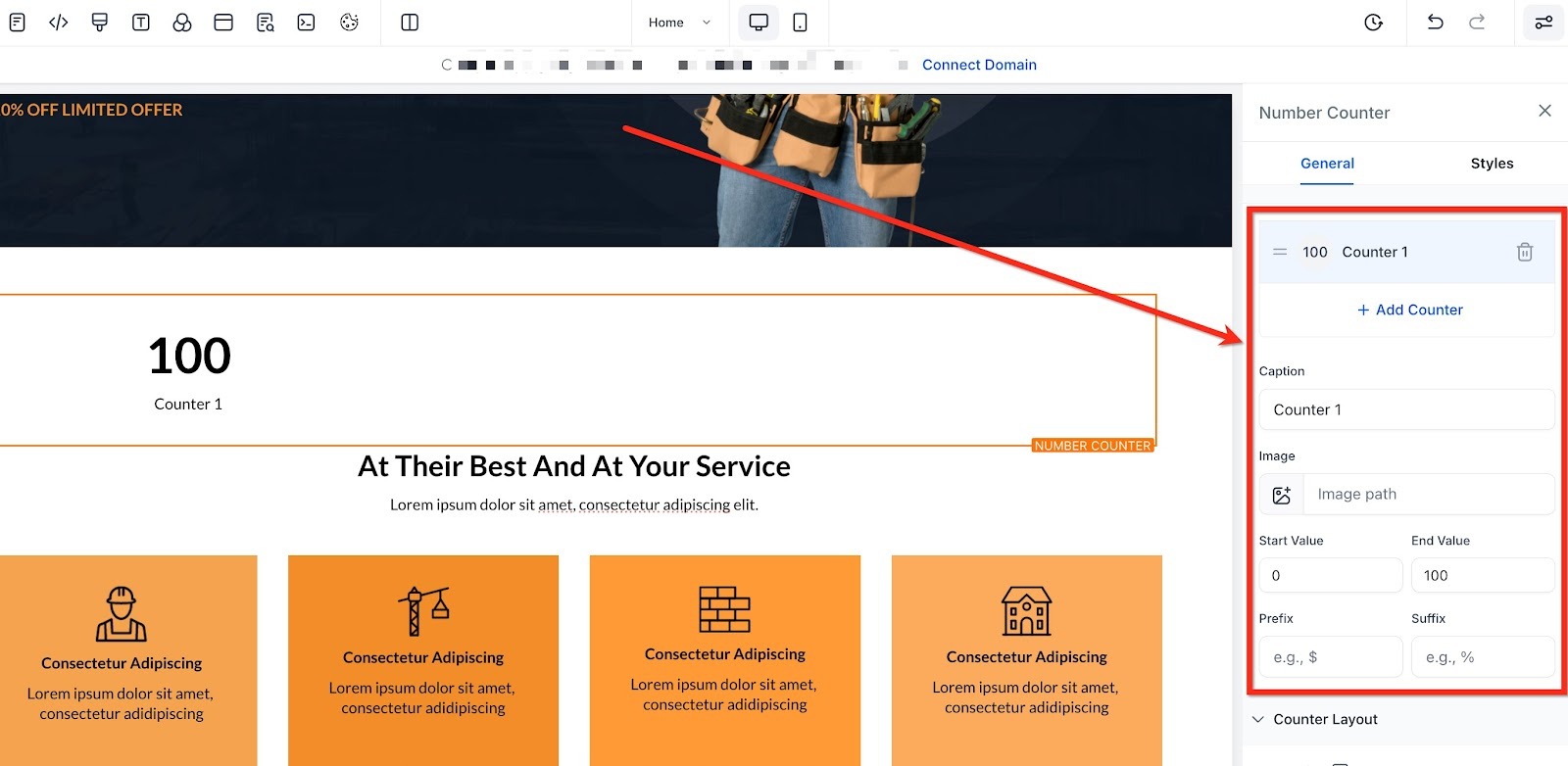 After configuring your metrics, use the options under Counter Layout to refine spacing, colors, animation speed, and overall layout so the counters blend perfectly with your brand. Key style controls include: