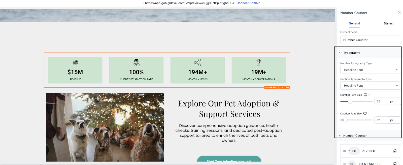 The Number Counter Widget is a native element in the Funnels & Websites builder that transforms numerical values into lively, count‑up animations. By combining smart formatting, customizable layout controls, and on‑scroll triggers, it lets you present key achievements in a way that’s both visually compelling and brand‑consistent.