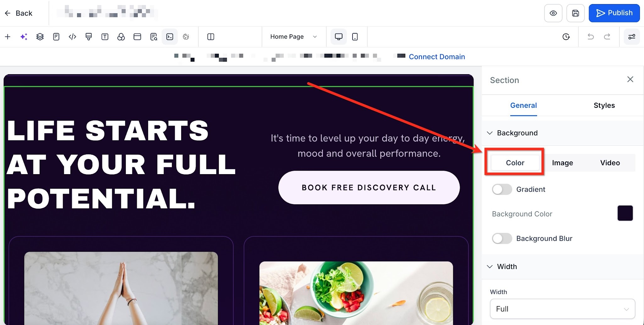 Under Background, select the Color tab to open color settings.