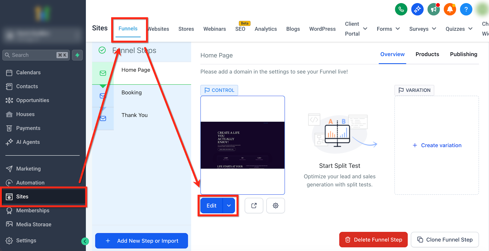 Navigate to Sites > Funnels / Websites.