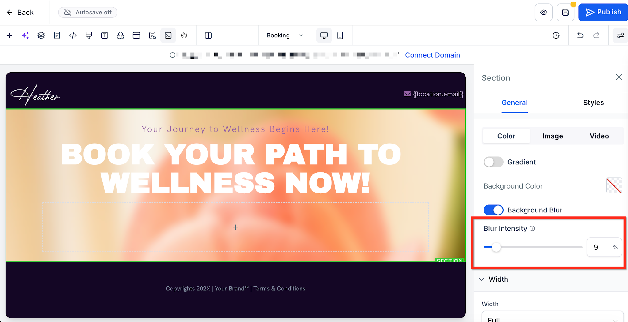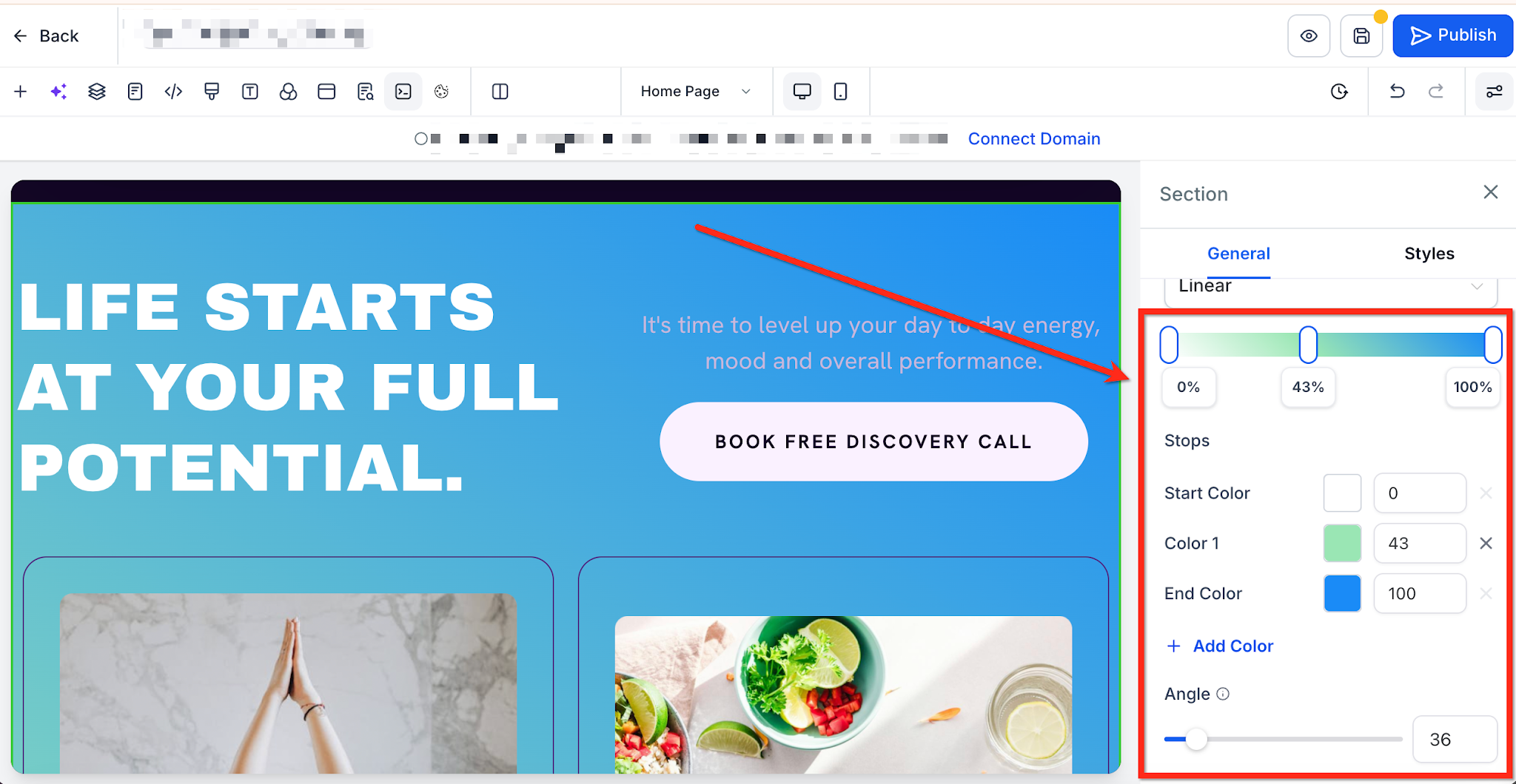 Gradients let you blend two or more colors smoothly to create visual depth, while background blur softens the content beneath an element to boost contrast and readability. Together, these tools reduce the need for external design apps and help you build polished layouts directly in MarketingPlex