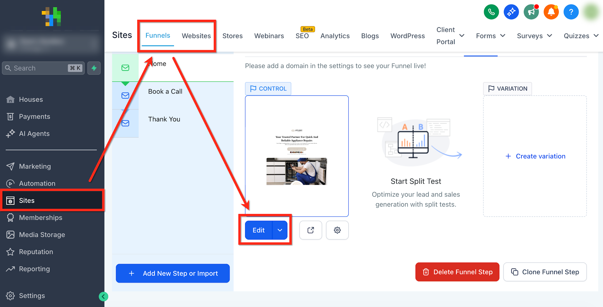 Open the Page Builder for your funnel or website page by navigating to Sites > Funnels or Websites.