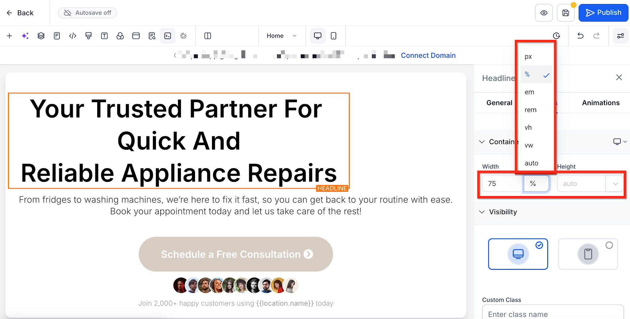 Container Size is a built-in control in the page builder that lets you define an element’s height and width directly in the builder. These values determine how much space an element occupies within its parent container (e.g., column, row, or section). You can choose units that best fit your layout goals and set device-specific values for responsive designs.