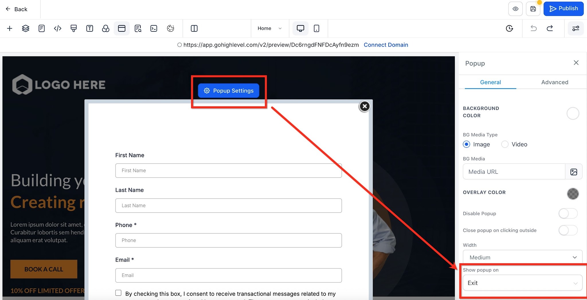 Exit intent pop-ups are triggered when a user's cursor behavior indicates they are about to leave your site, typically by moving toward the browser bar or close button. MarketingPlexl enables you to design pop-ups within the website or funnel builder and configure them to trigger based on exit intent.