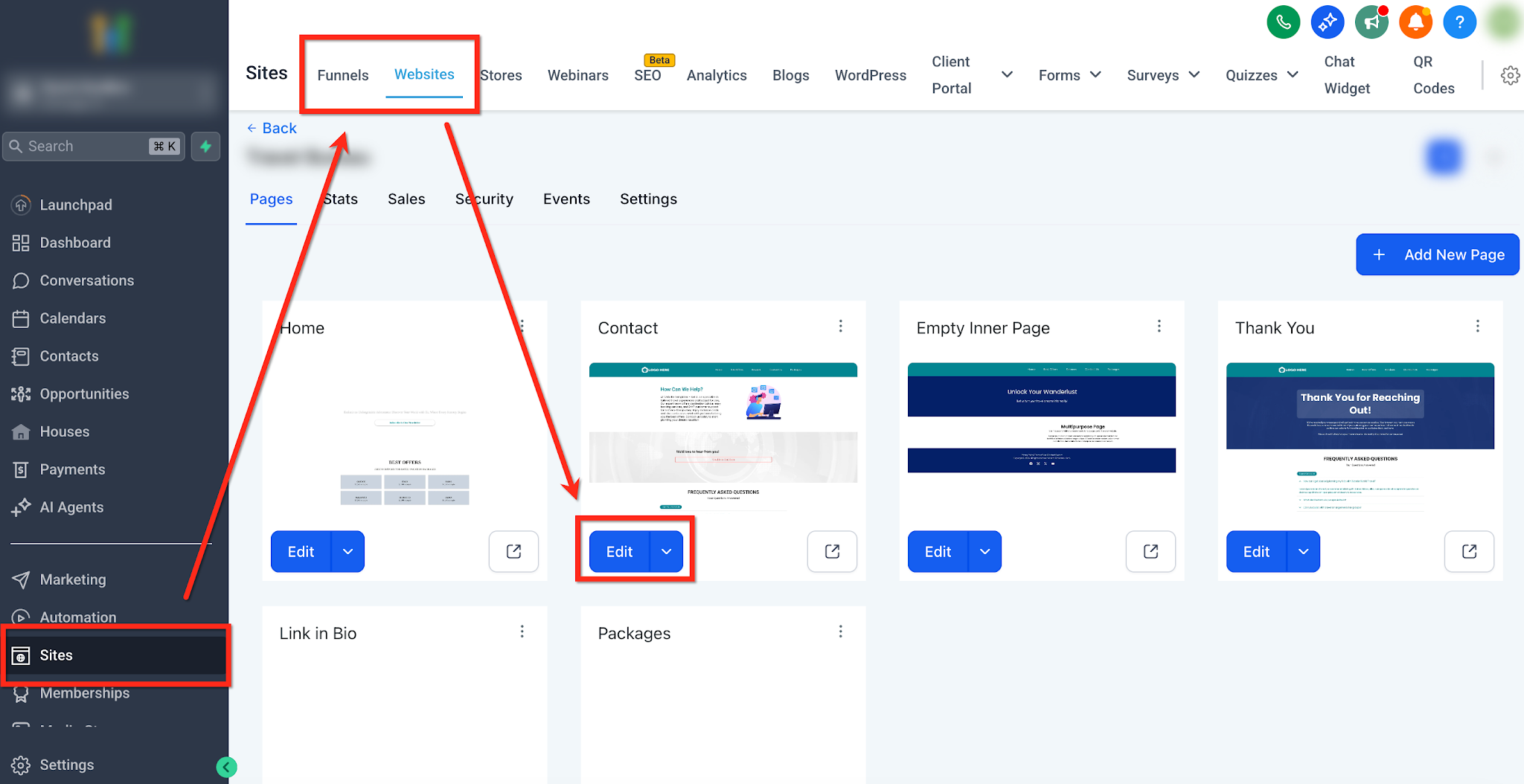 Open Sites → Websites (or Funnels) and choose the page to edit.