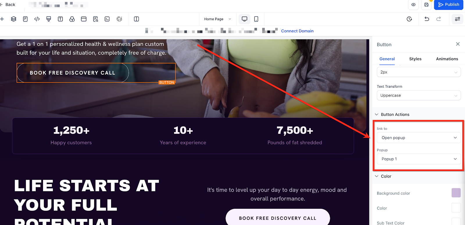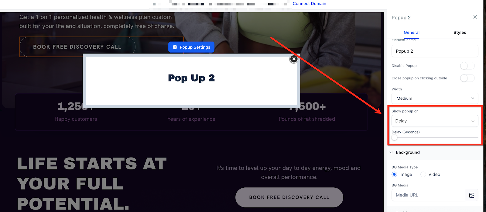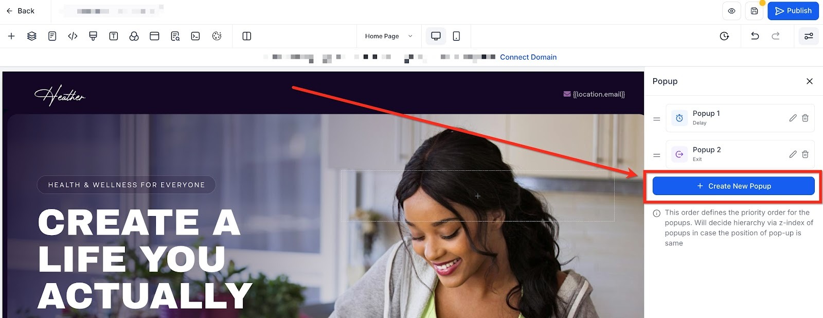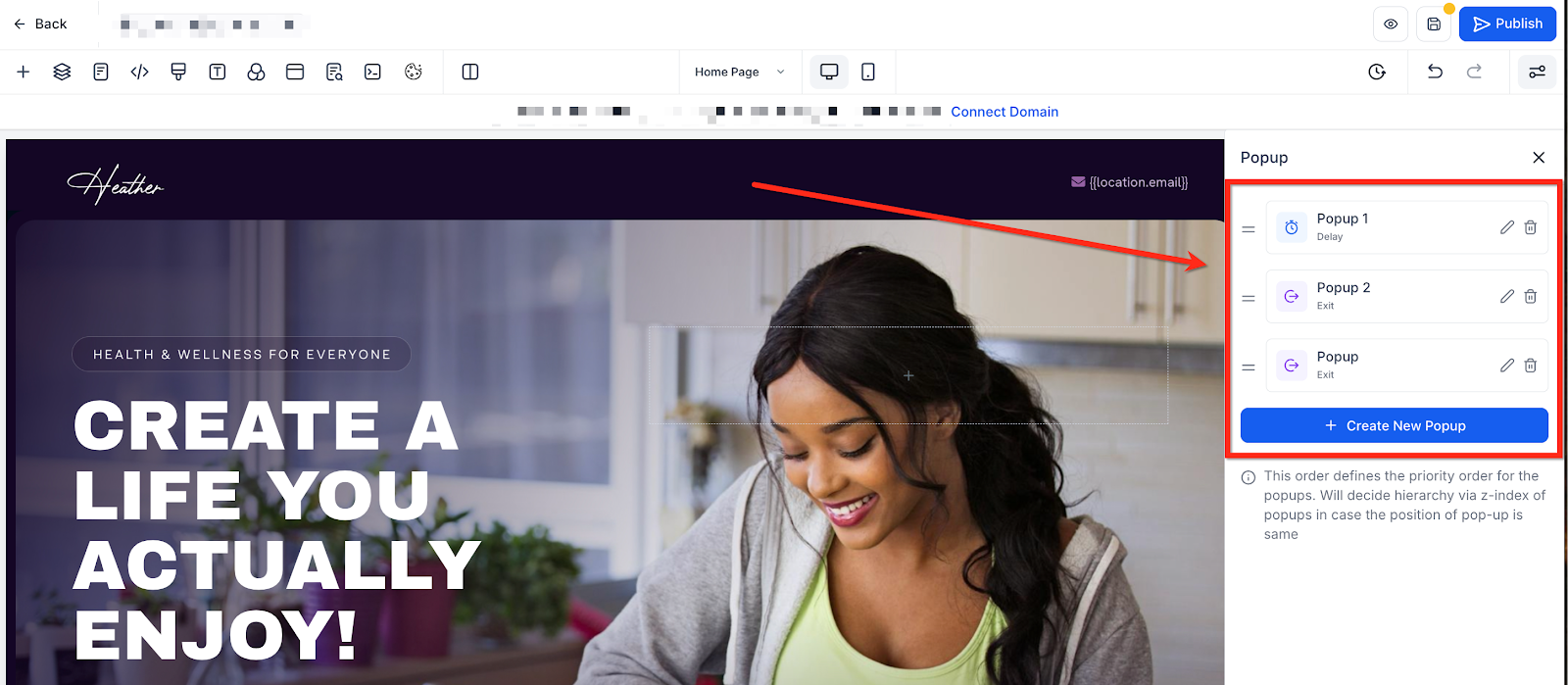 Easily set up and manage your popups from the Popup Settings panel in the page builder: