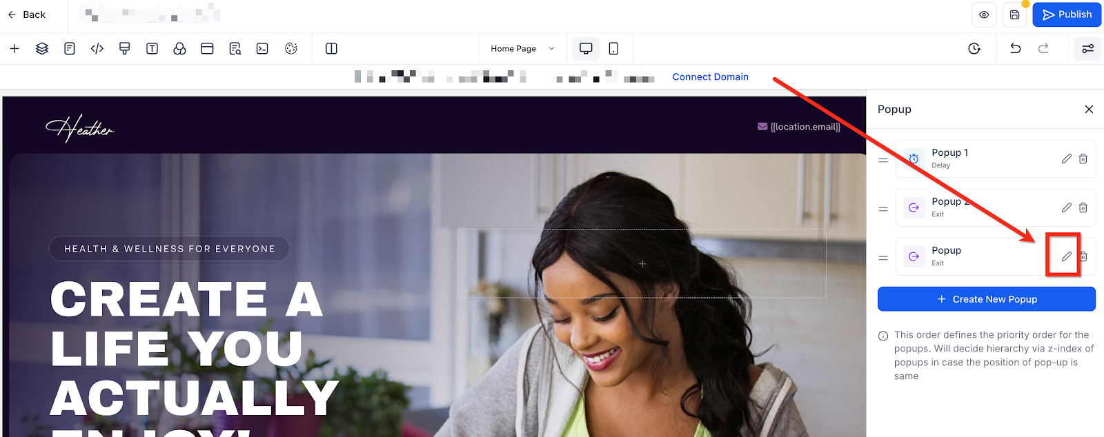 Click the Edit (Pencil) icon located next to the popup you created. Edit the pop-up just like a section. Add text, forms, buttons, images, videos, or countdowns.