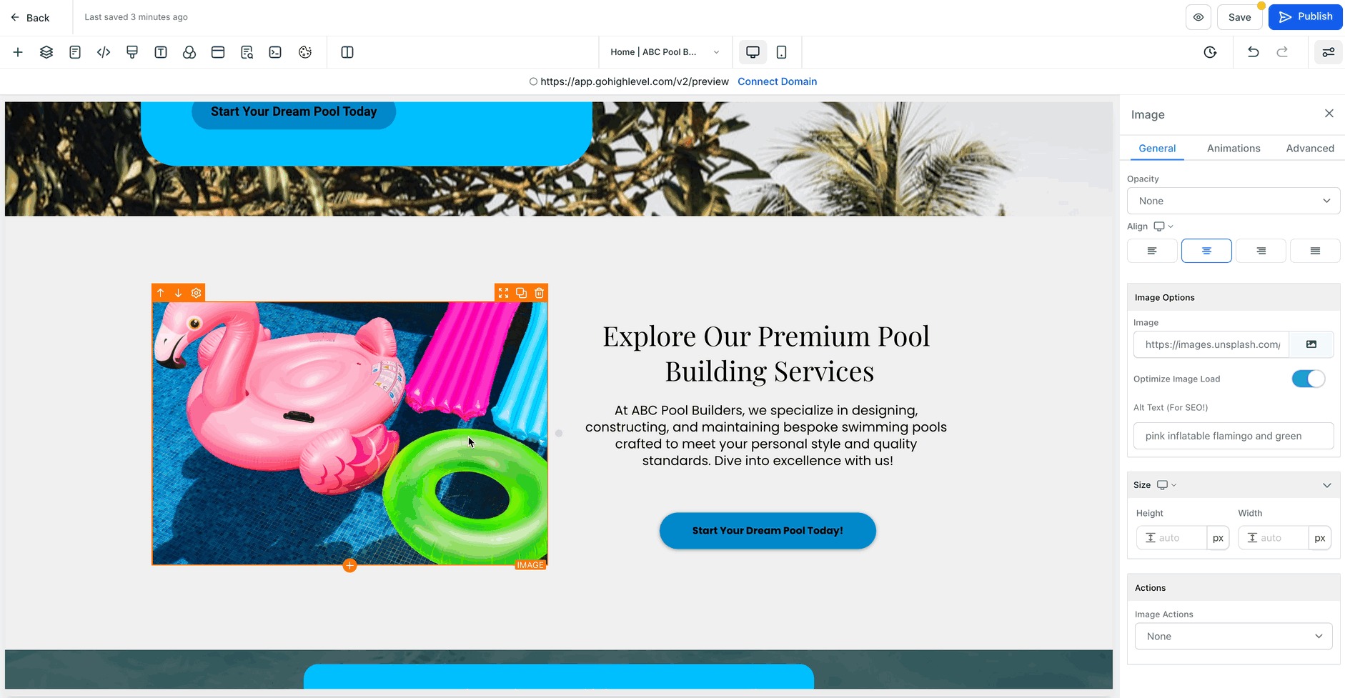 Note: To set different image dimensions for mobile and desktop, use the view toggle at the top of the builder to switch between views. Enter height and width values while in each specific view—changes made in mobile view apply only to mobile, and those made in desktop view apply only to desktop. This allows you to optimize image sizing separately for each device.