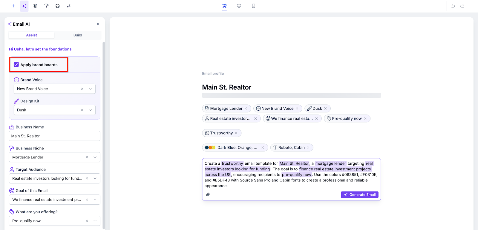 Email AI is a guided, brand-aware experience inside MarketingPlex’s Email Marketing builder that helps you plan, draft, and design emails quickly. It leverages your Brand Board for fonts and colors, recommends layouts, and lets you refine content conversationally, so you can launch emails faster with more control and less rework.