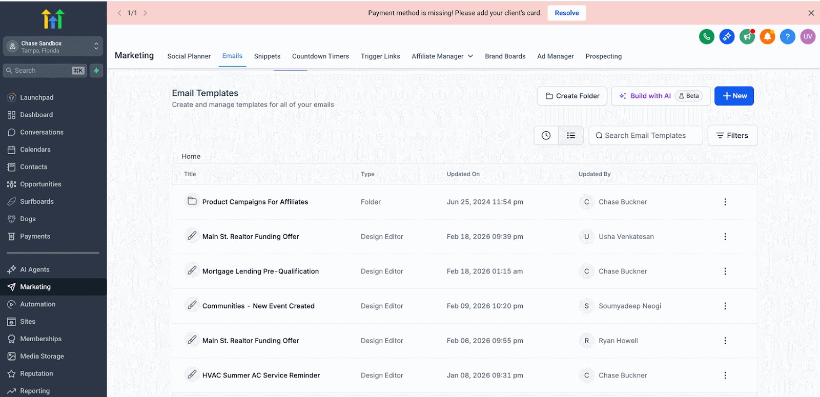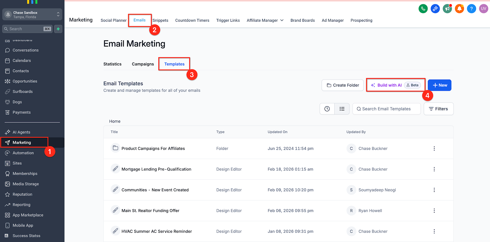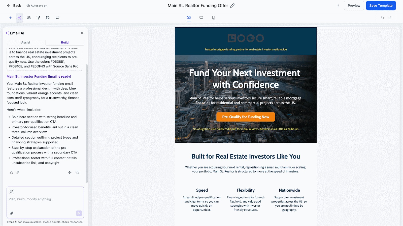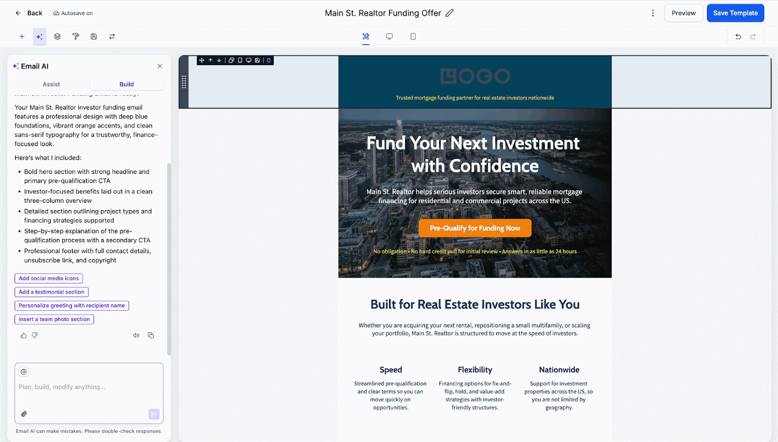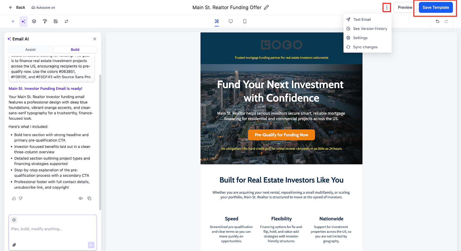 Click Build with AI (or open an existing campaign/template and choose the AI option in edit mode).