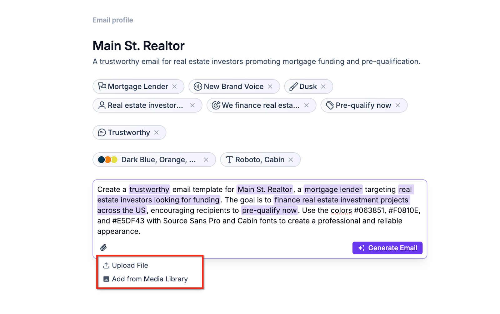 Reference-Based Generation: Recreate an email you like from a URL or image, then adapt it to your brand.