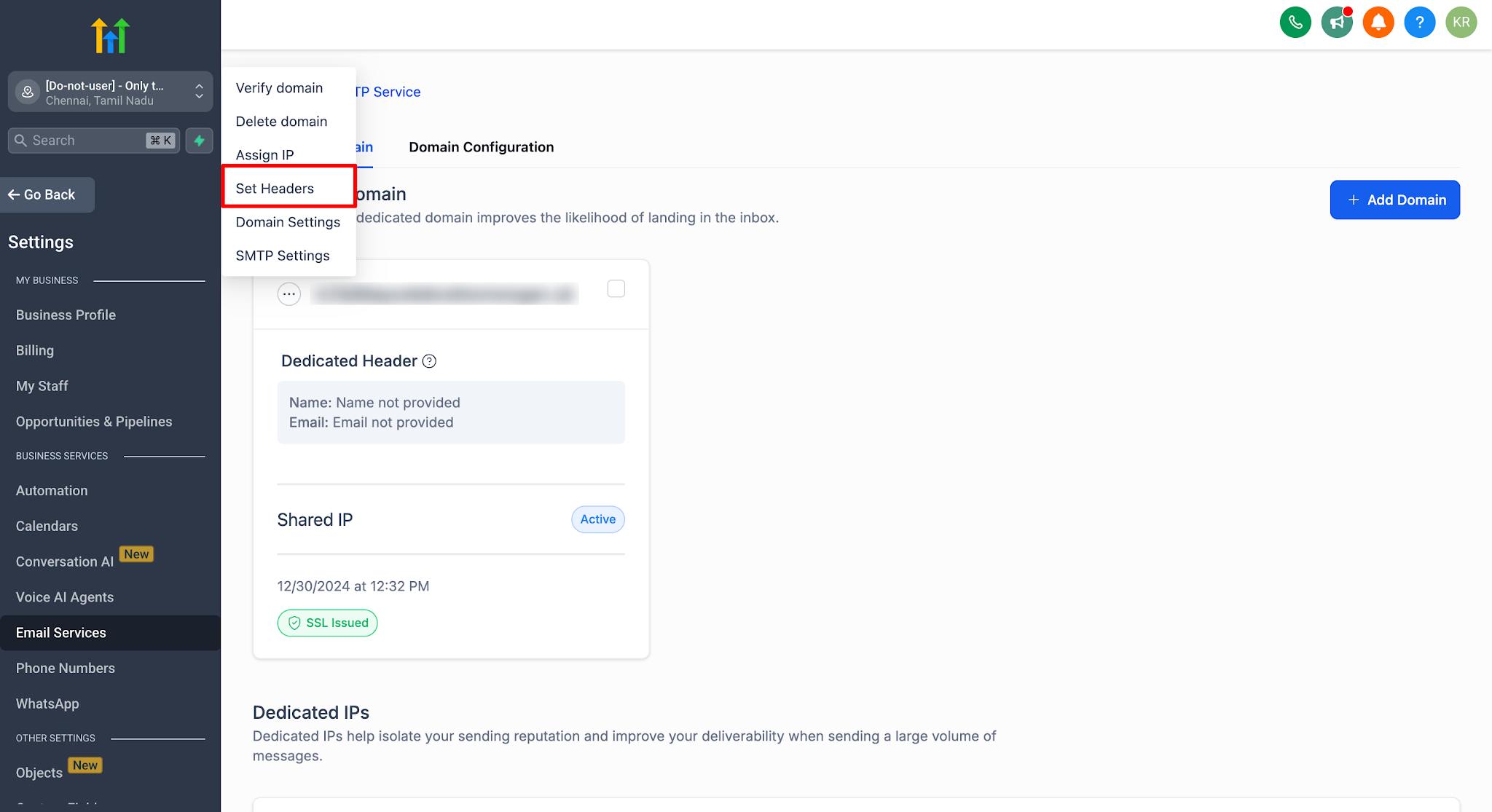Only sub-accounts can add and manage dedicated sending domains and set default headers. Agency-level domains do not support per-sub-account default headers.