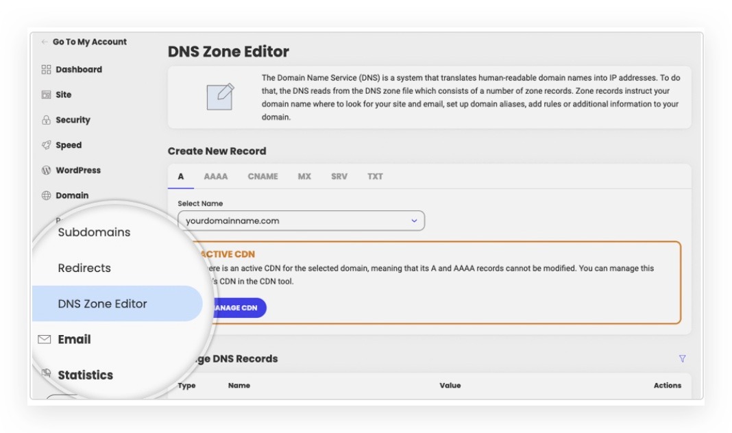 The next screen that you're taken to will ask you to add DNS records to your Domain. Leave this screen open for the next step.