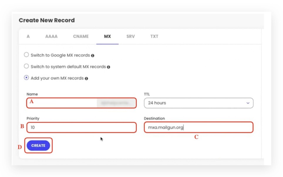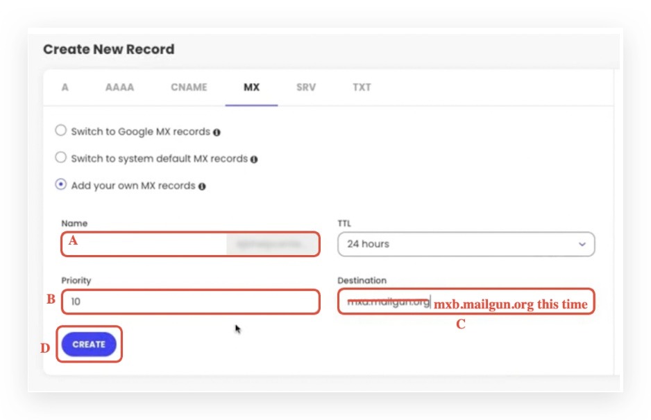 Add another MX record again, this time Destination will be mxb.mailgun.org