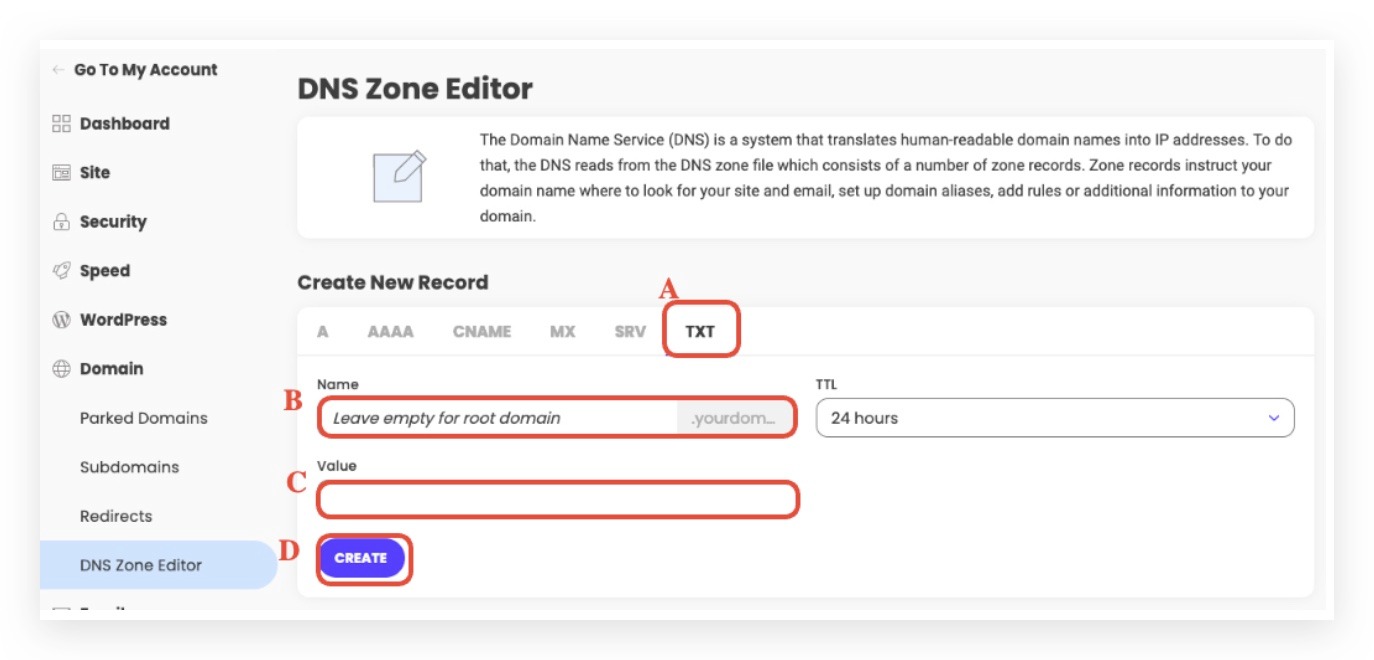 C. Value: Head back to MarketingPlex and Copy and paste the 2nd TXT record here highlighted in the screenshot below