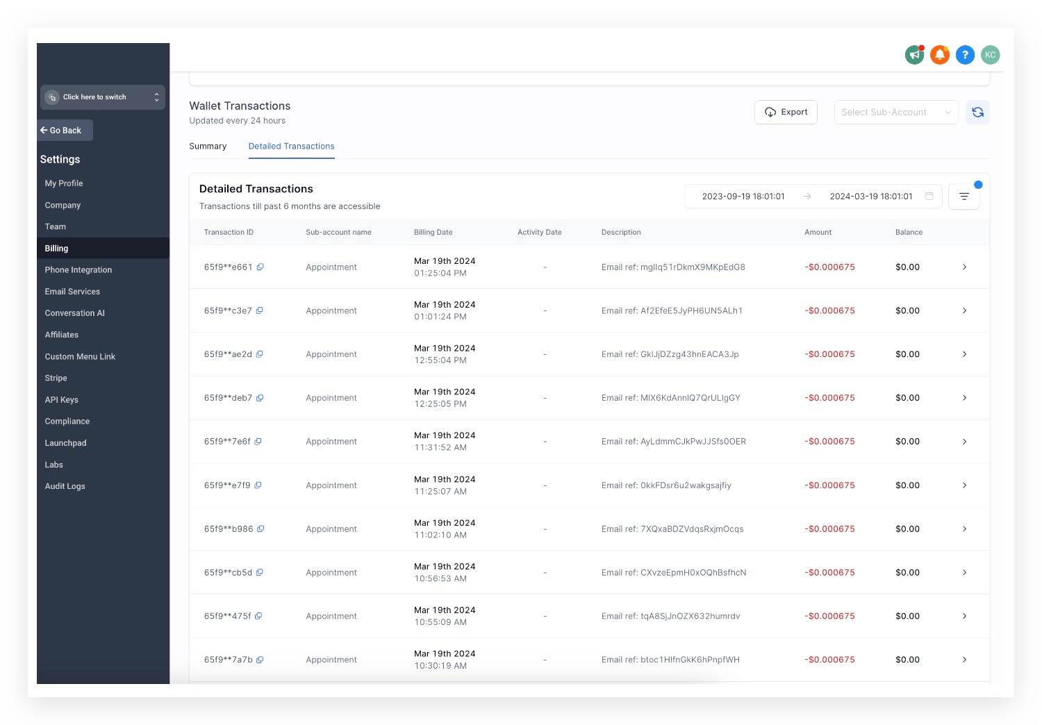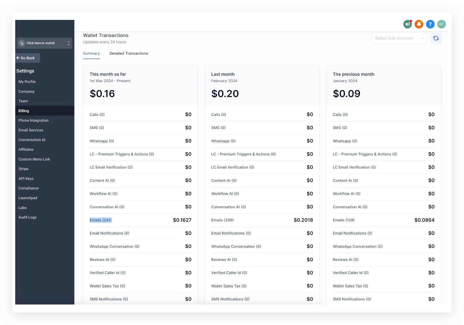 To view detailed billing notifications; Go to -> Settings -> Billing -> Wallets & Transactions -> Detailed Transactions: