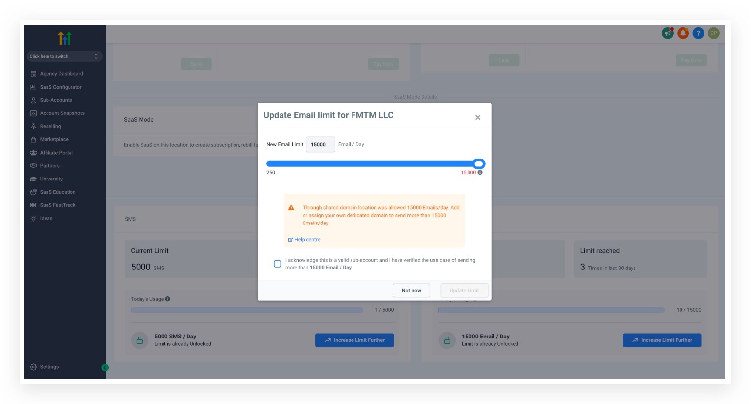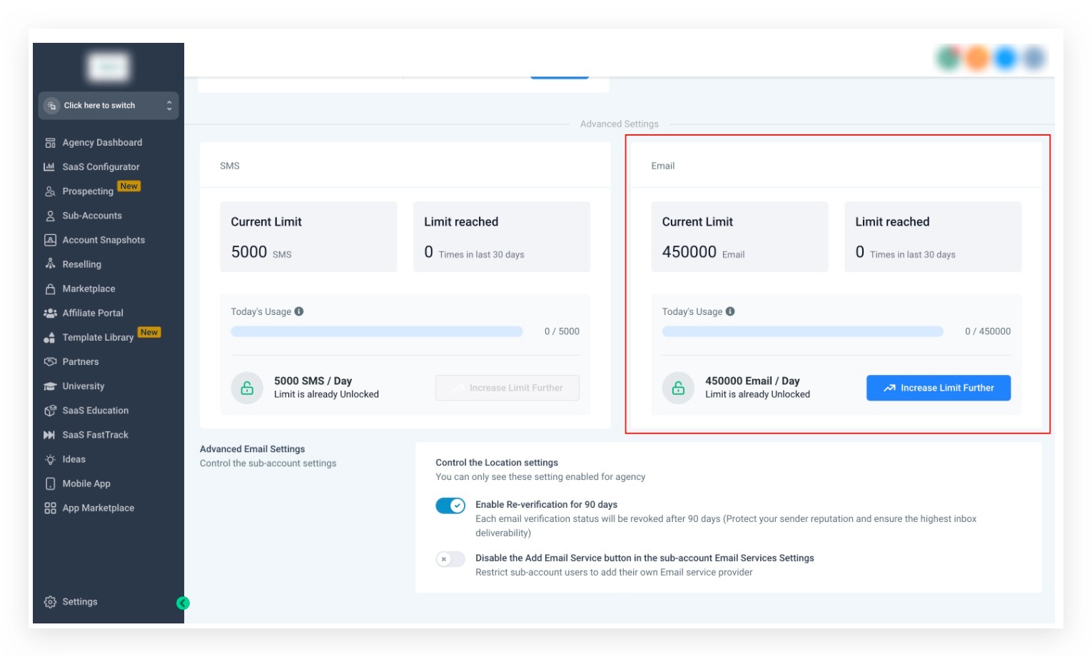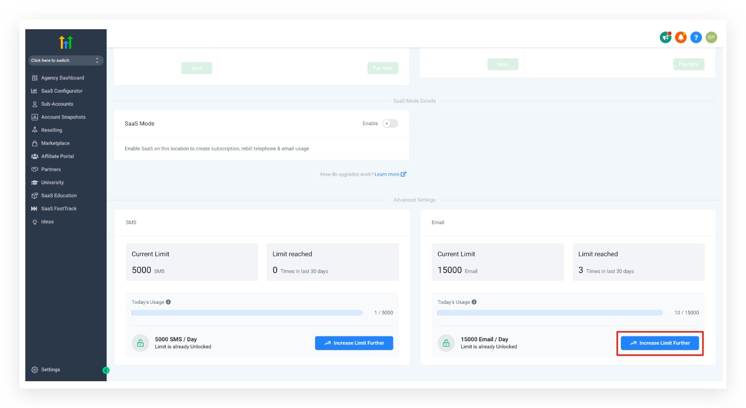 Go to the sub-account detail page by navigating to "Agency View" > "Sub-Accounts" > Search and click on the Sub-Account Name and scroll down to the "Additional Settings" section to increase the limit.